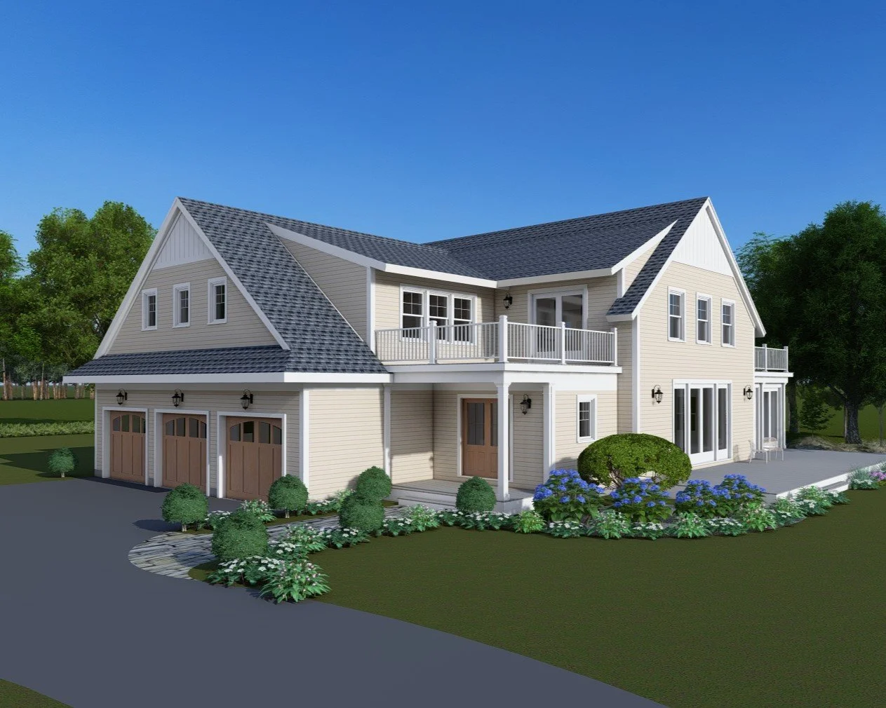 3 Bay Garage with 9ft doors and 240V electrical vehicle charging station connection ready. Slat wall organizing system with cabinets for storage and epoxy floors are also available as a customer add on.